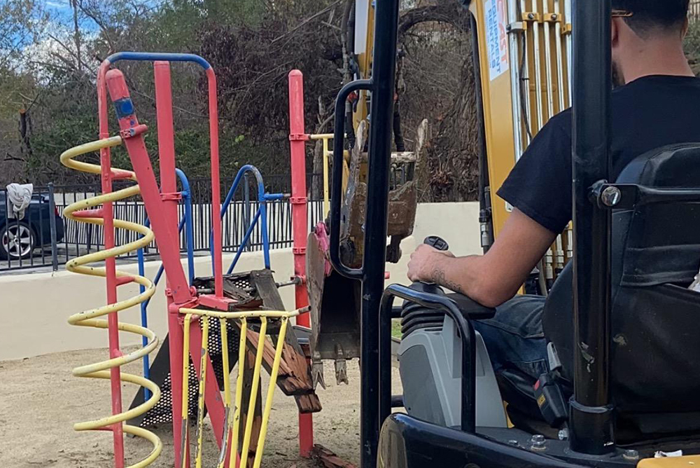 A worker operating heavy machinery to dismantle colorful playground structures, including a spiral slide and climbing frame.
