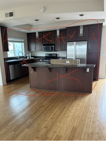 A sleek, fully-equipped kitchen with red X markings on the cabinetry and walls, indicating elements planned for removal.